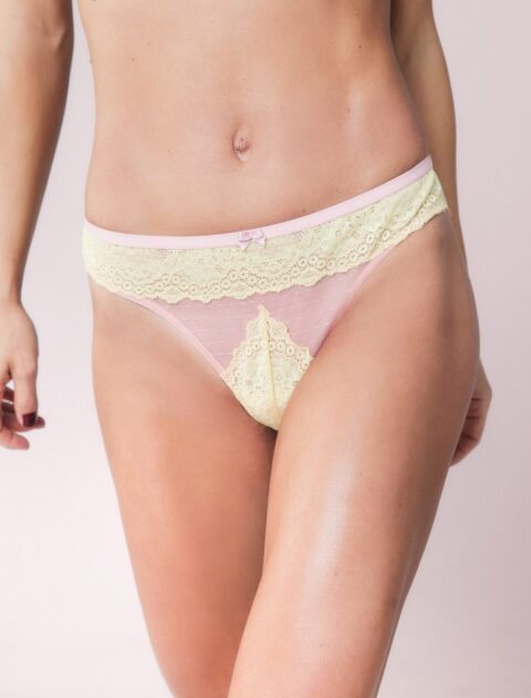 Minimalistički model donjeg veša sa uskim trakama sa strane i minimalnom pokrivenošću zadnjeg dela, dizajniran da eliminiše vidljive linije ispod odeće i pruži osećaj slobode. Obično su izrađene od elastičnih i laganih materijala poput mikrofibera, čipke ili pamuka, čineći ih udobnim za svakodnevno nošenje ili posebne prilike kada je potreban neprimetan izgled ispod uske odeće.